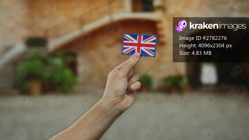 Hand of a man holding embroidered great britain flag on a street in a european town setting with stone buildings and greenery.