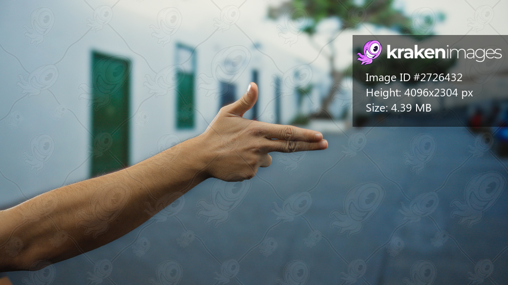Hand of a man making a gun gesture in an outdoor city street setting with white buildings in the background, capturing a playful and casual urban moment. - Kraken Images