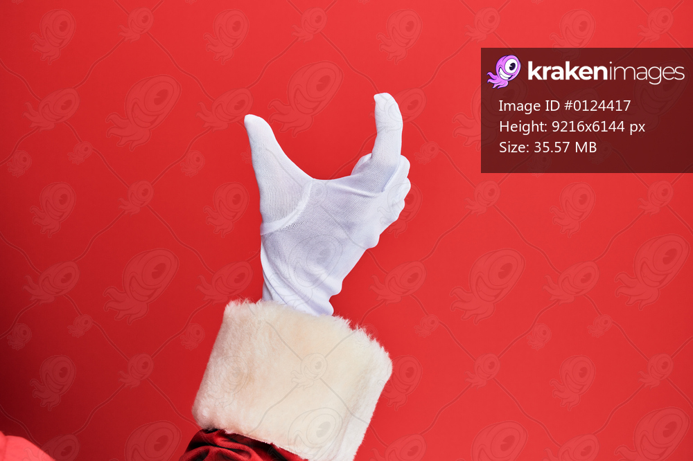 Hand of a man wearing santa claus costume and gloves over red background picking and taking invisible thing, holding object with fingers showing space
