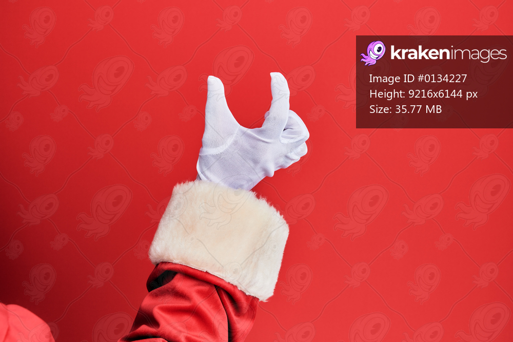 Hand of a man wearing santa claus costume and gloves over red background picking and taking invisible thing, holding object with fingers showing space