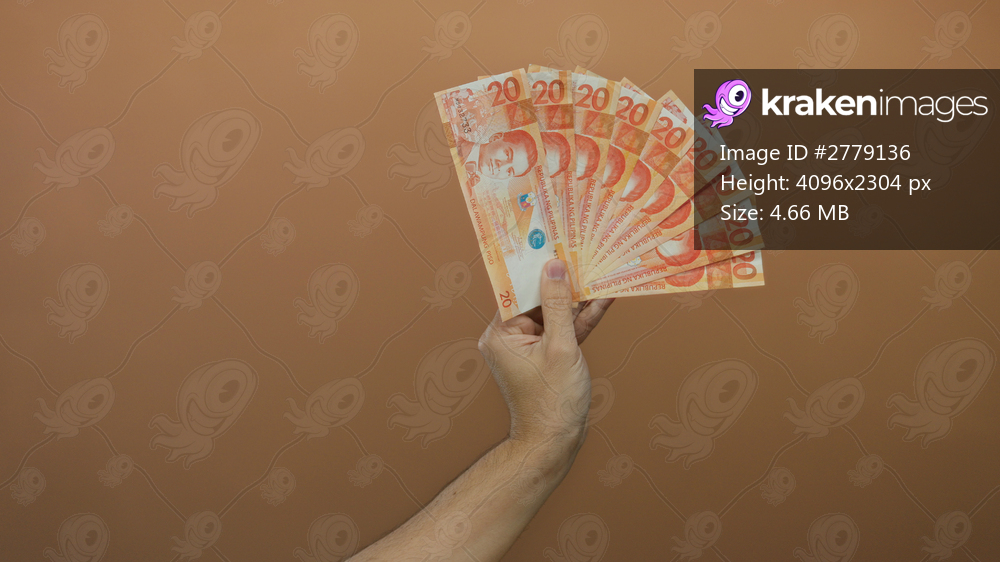 Hand of caucasian man holding multiple philippine pesos against brown wall background.