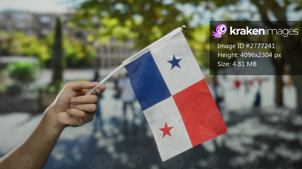 Hand of caucasian man holding panama flag on city street with blurred people and trees in background, symbolizing national pride and celebration outdoors. - Kraken Images