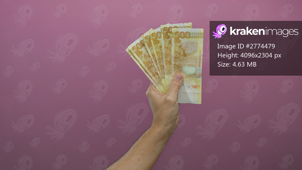 Hand of caucasian man holding philippine pesos against a vibrant pink background.