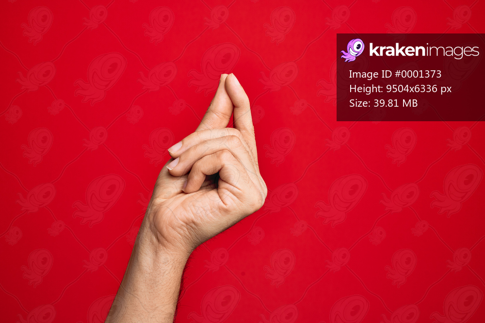Hand of caucasian young man showing fingers over isolated red background holding blank space with thumb finger, business and advertising