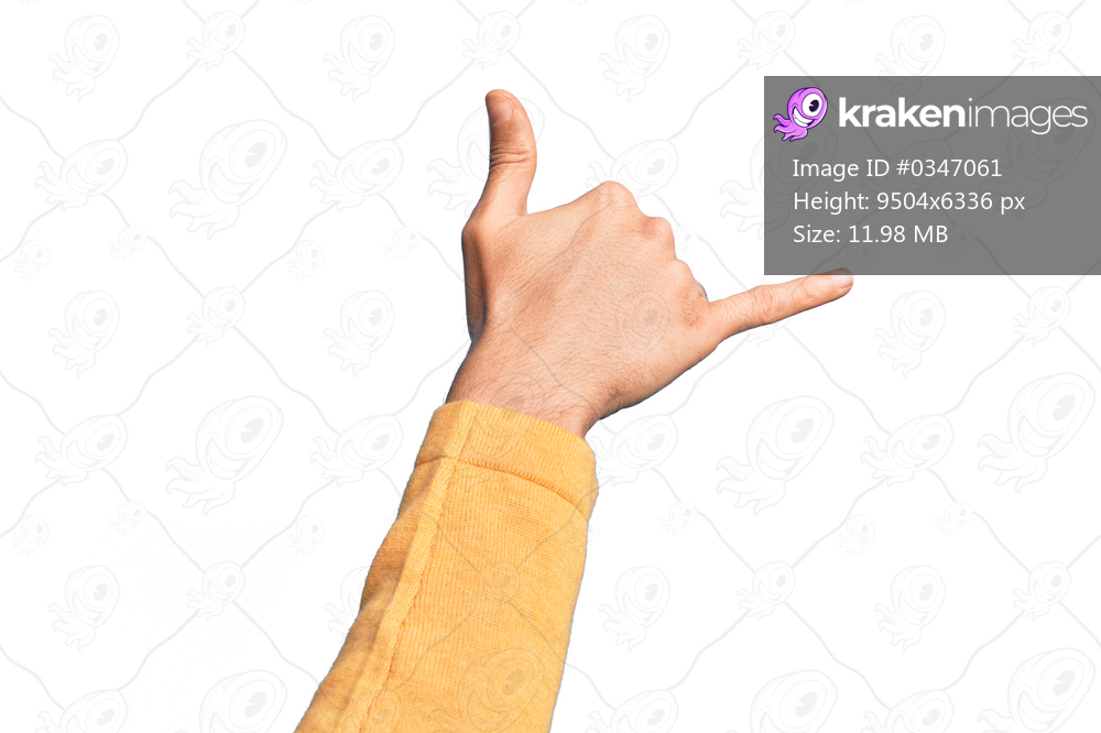 Hand of caucasian young man showing fingers over isolated white background gesturing Hawaiian shaka greeting gesture, telephone and communication symbol - Kraken Images