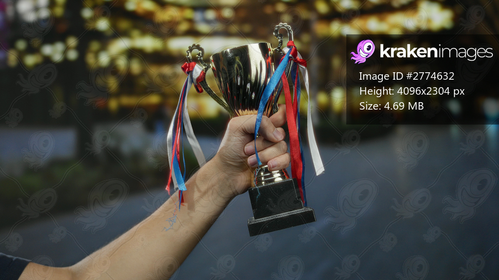 Hand of man holding a trophy with ribbons in a nighttime city street, symbolizing victory, success, and achievement in a lively urban outdoor scene.