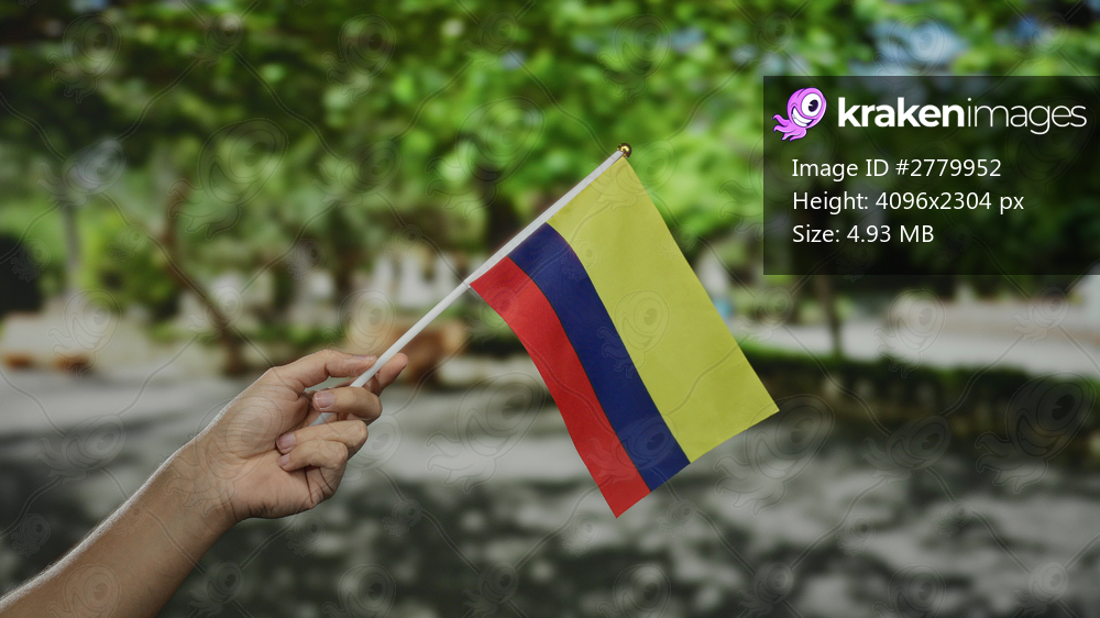 Hand of man waving colombian flag outdoors in park setting, capturing vibrant national colors and a sense of pride and celebration.