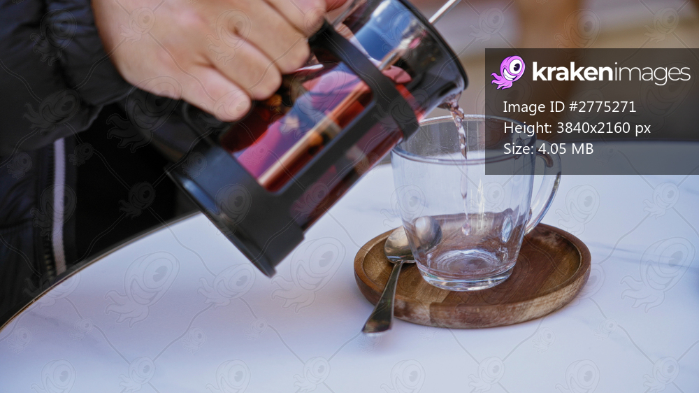 Hand pouring hot beverage from glass teapot into cup on table in cozy cafe setting, showcasing relaxation and warmth.