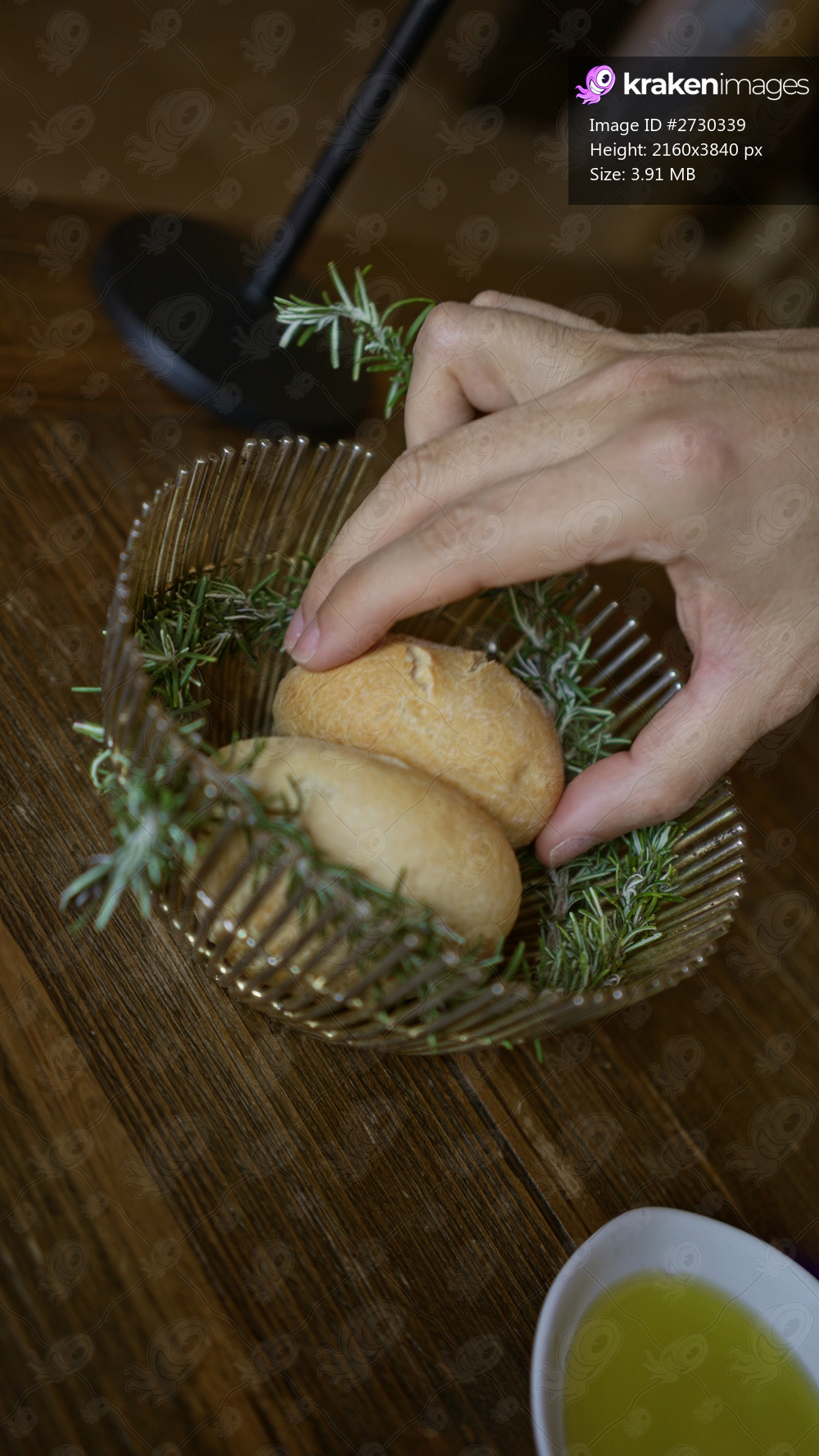 Hand reaching for bread in a rosemary-lined bowl on a wooden table in a mediterranean restaurant setting with a dish of olive oil nearby, showcasing rustic dining elegance. - Kraken Images