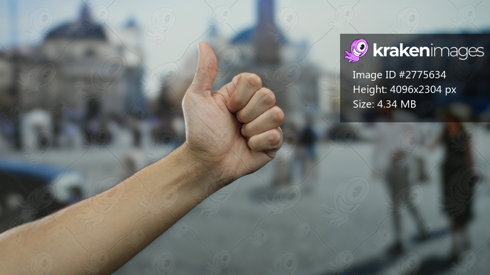 Hand with thumbs up gesture by man in vatican city san pedro square outdoor setting with blurred background.