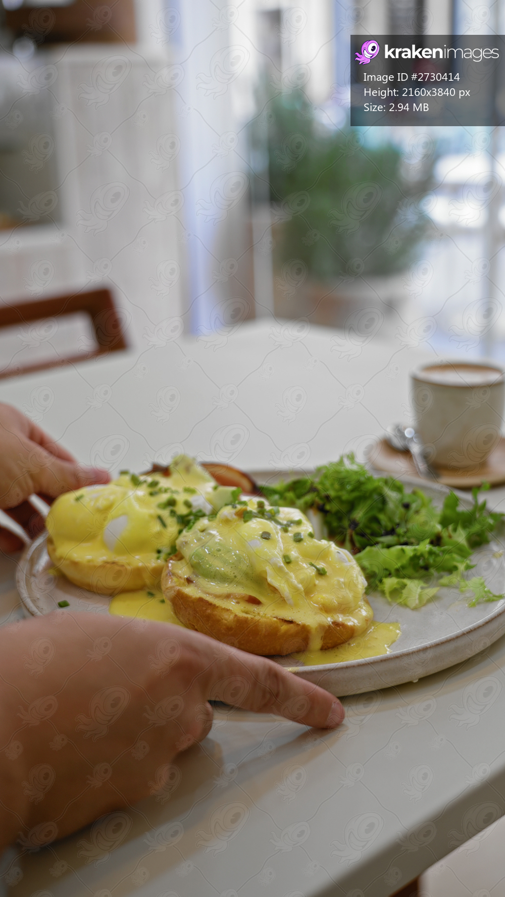 Hands serving eggs benedict with salad and coffee in a cozy restaurant setting, highlighting delicious breakfast and pleasant indoor dining experience. - Kraken Images