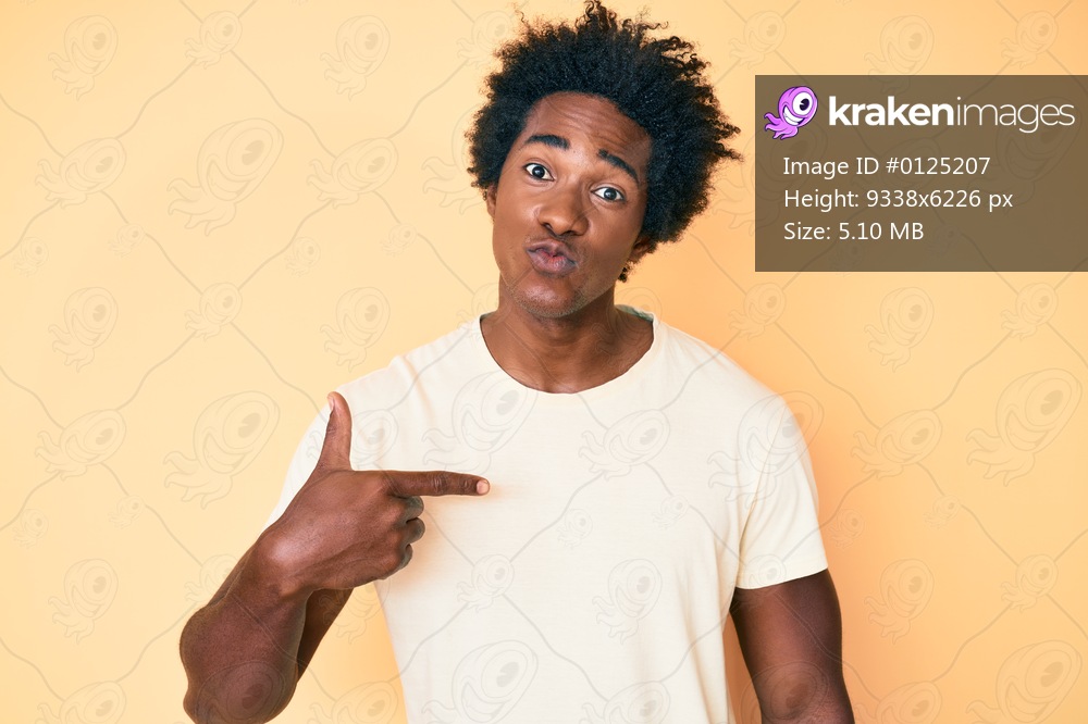Handsome african american man with afro hair pointing with fingers to himself looking at the camera blowing a kiss being lovely and sexy. love expression. - Kraken Images