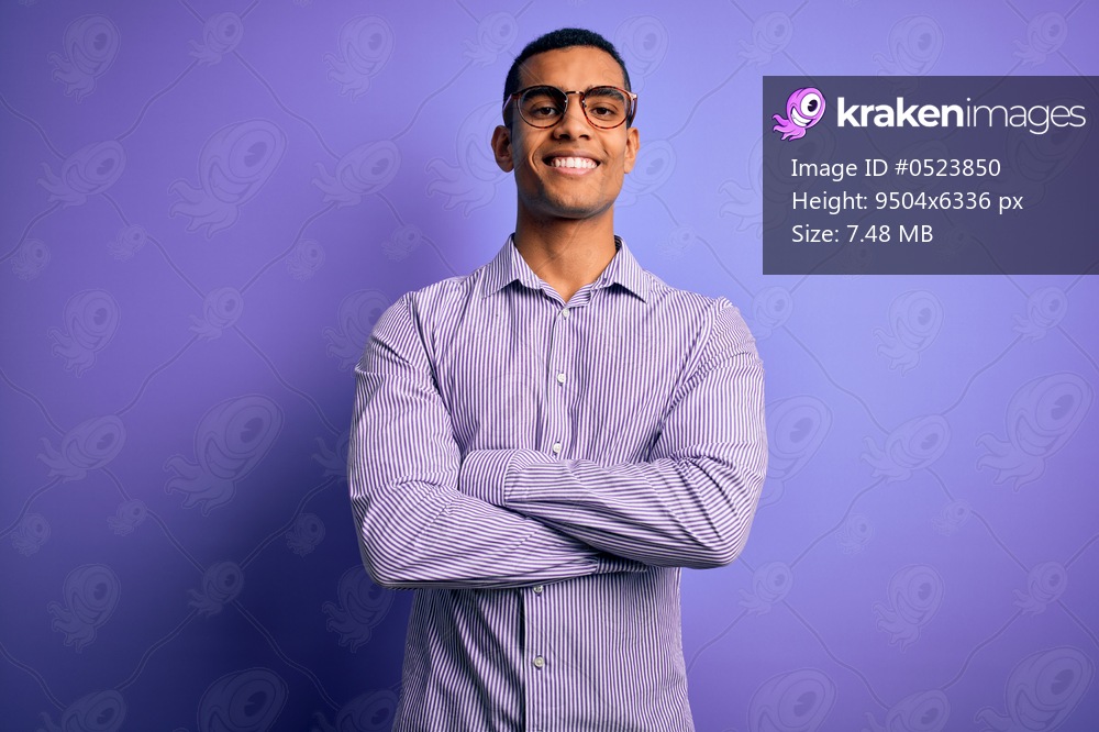 Handsome african american man wearing striped shirt and glasses over purple background happy face smiling with crossed arms looking at the camera. Positive person. - Kraken Images
