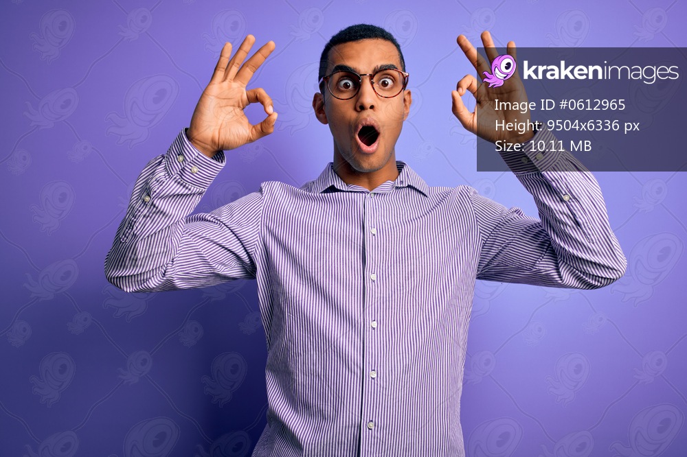 Handsome african american man wearing striped shirt and glasses over purple background looking surprised and shocked doing ok approval symbol with fingers. Crazy expression - Kraken Images