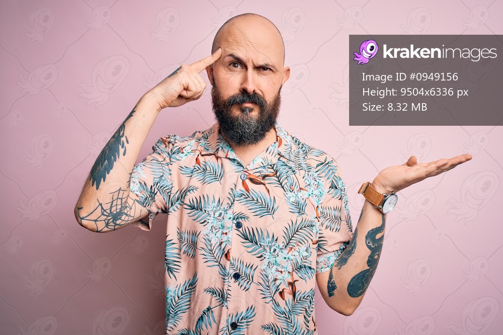 Handsome bald man with beard and tattoo wearing casual floral shirt over pink background confused and annoyed with open palm showing copy space and pointing finger to forehead. Think about it. - Kraken Images