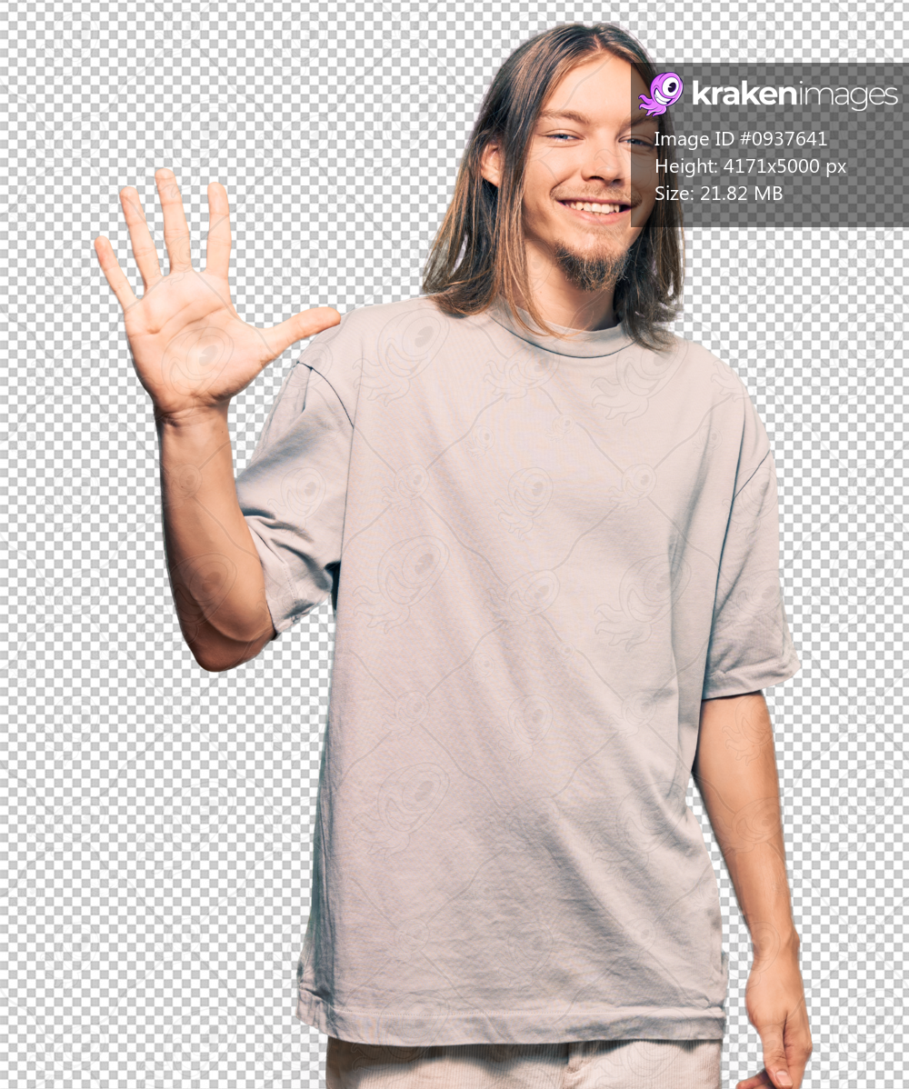 Handsome caucasian man with long hair wearing casual clothes showing and pointing up with fingers number five while smiling confident and happy.
