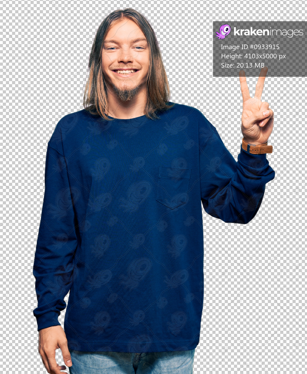 Handsome caucasian man with long hair wearing casual winter sweater showing and pointing up with fingers number two while smiling confident and happy.
