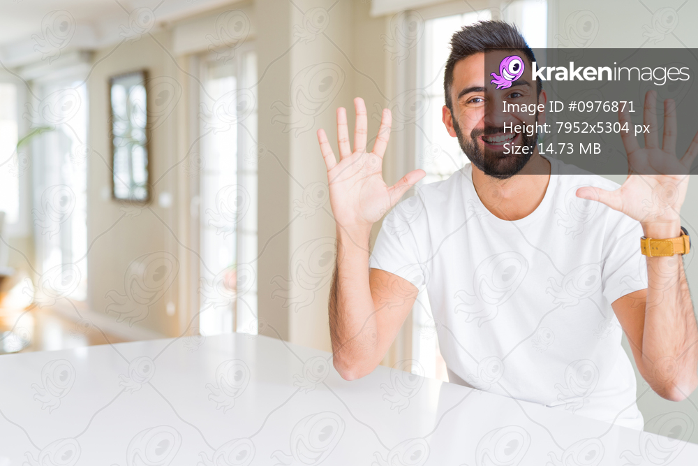 Handsome hispanic man casual white t-shirt at home showing and pointing up with fingers number ten while smiling confident and happy.