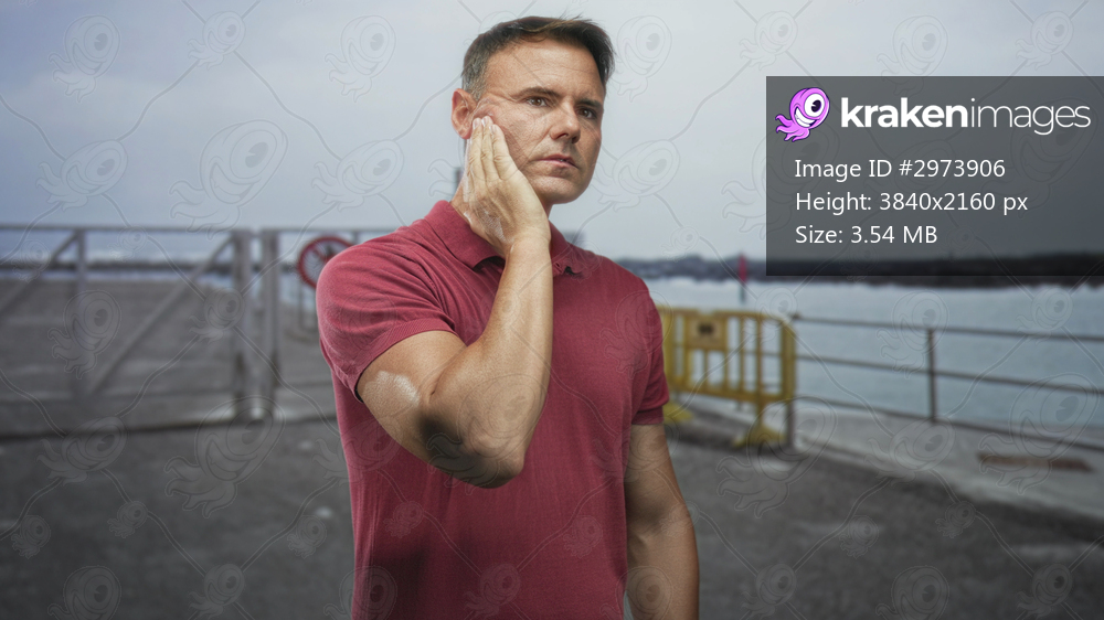 Handsome hispanic man with hand on cheek wincing near pier railing and yellow barrier by the water; toothache pain.