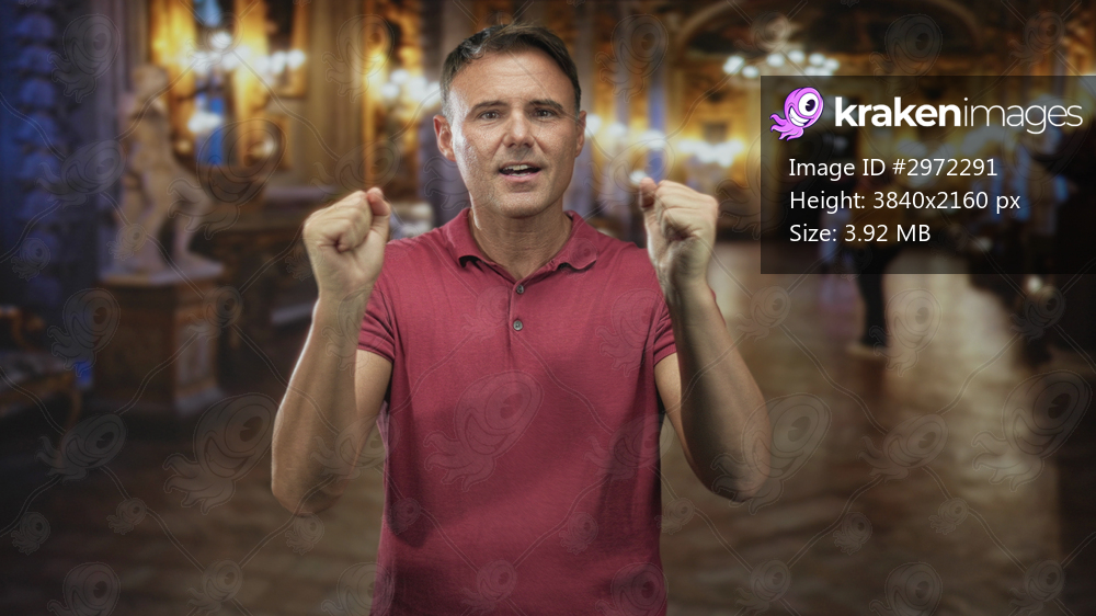 Handsome hispanic man in red polo with hands raised, palms visible, gesturing in ornate building hall with chandeliers; thoughtful reflection.
