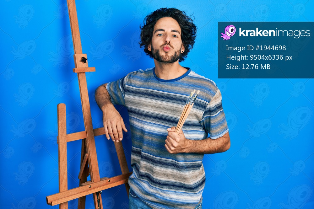 Handsome hispanic man standing by empty easel stand holding brushes looking at the camera blowing a kiss being lovely and sexy. love expression.
