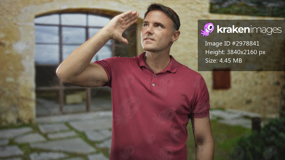 Handsome hispanic man touching forehead with palm and closed eyes, wearing red polo standing before an old stone building entrance; relief.