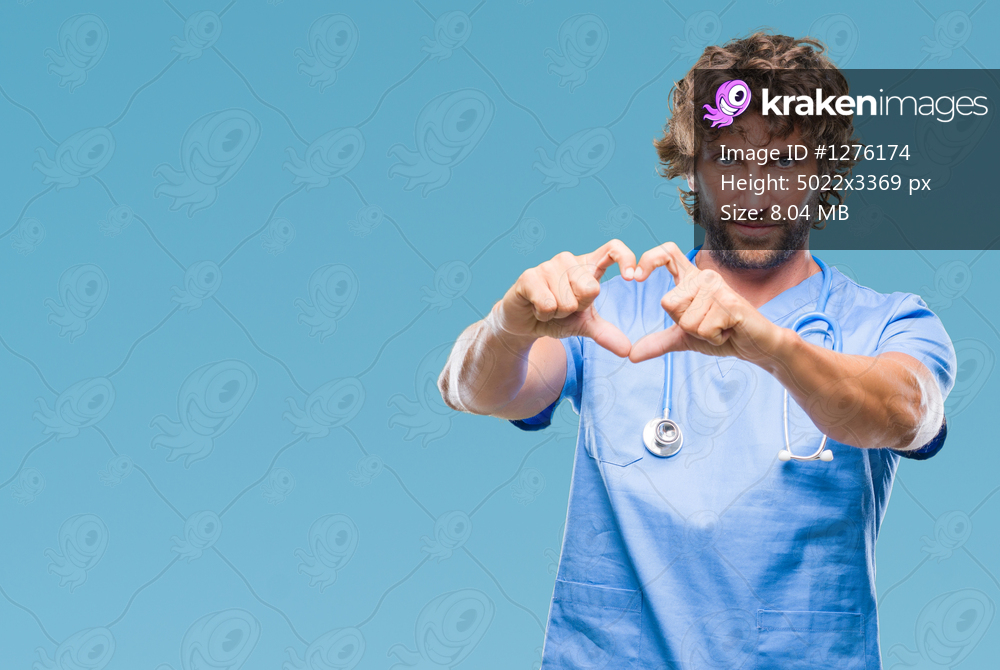 Handsome hispanic surgeon doctor man over isolated background smiling in love showing heart symbol and shape with hands. Romantic concept.