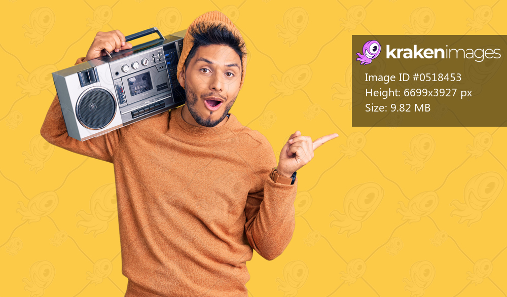 Handsome latin american young man holding boombox, listening to music surprised pointing with finger to the side, open mouth amazed expression.