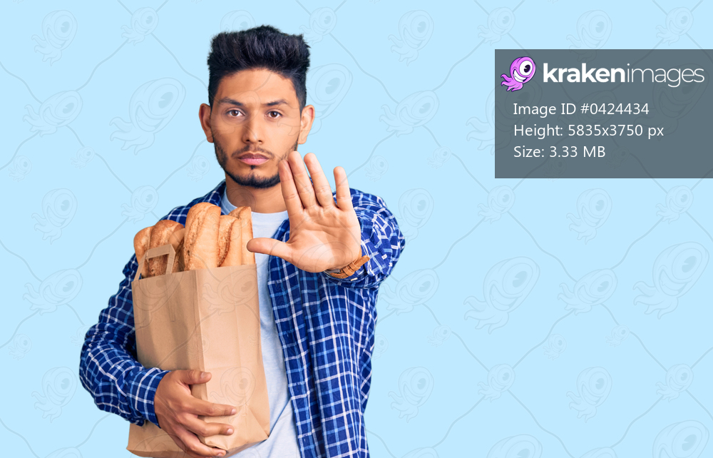 Handsome latin american young man holding paper bag with bread doing stop sing with palm of the hand. warning expression with negative and serious gesture on the face. - Kraken Images