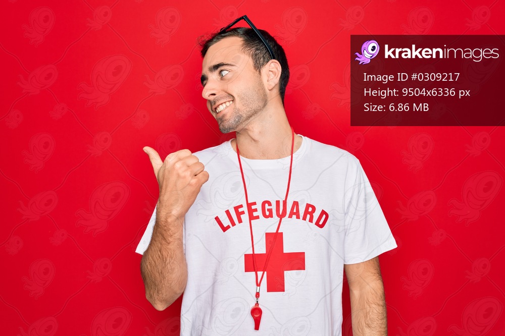 Handsome lifeguard man wearing t-shirt with red cross and whistle over isolated background smiling with happy face looking and pointing to the side with thumb up. - Kraken Images