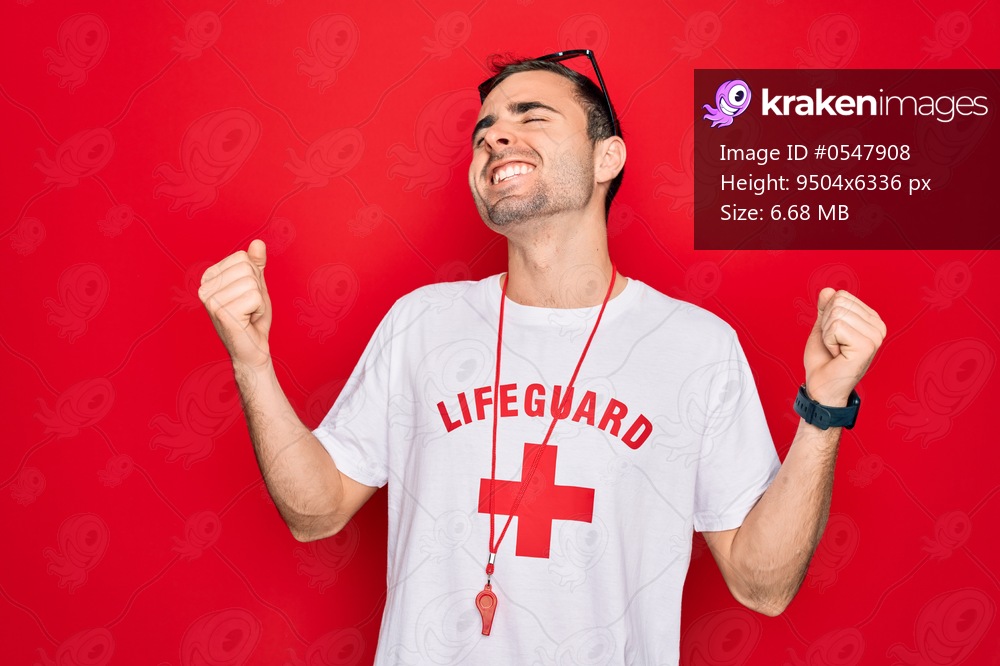 Handsome lifeguard man wearing t-shirt with red cross and whistle over isolated background very happy and excited doing winner gesture with arms raised, smiling and screaming for success. Celebration concept. - Kraken Images