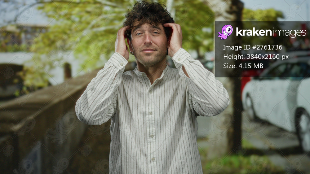 Handsome man adjusts hair and shirt outdoors on a sunny day, surrounded by trees and parked cars on a bustling street.