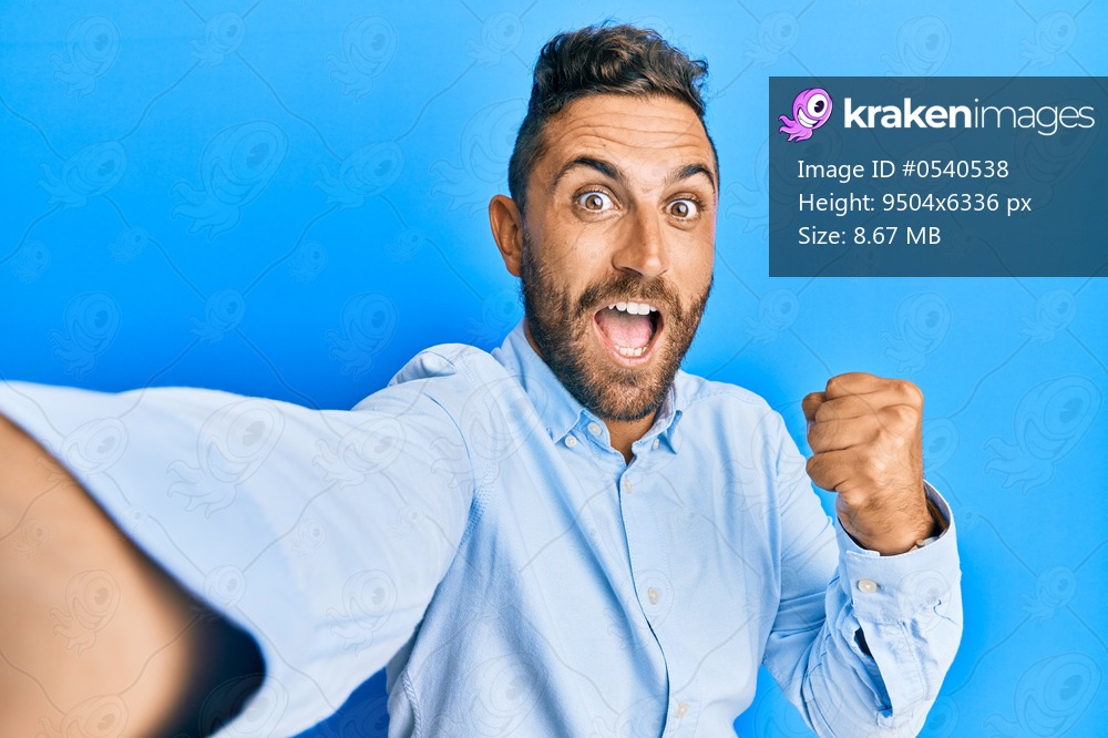 Handsome man with beard taking a selfie photo with smartphone screaming proud, celebrating victory and success very excited with raised arms
