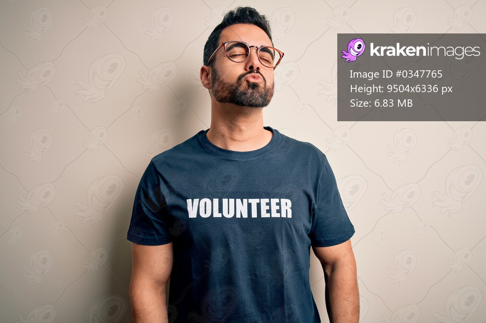 Handsome man with beard wearing t-shirt with volunteer message over white background looking at the camera blowing a kiss on air being lovely and sexy. Love expression. - Kraken Images