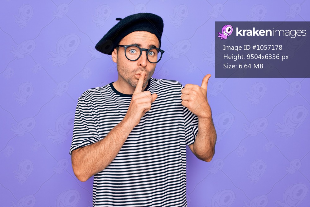 Handsome man with blue eyes wearing striped t-shirt and french beret over purple background asking to be quiet with finger on lips pointing with hand to the side. Silence and secret concept. - Kraken Images