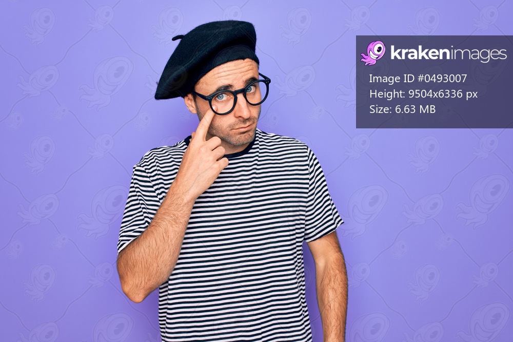 Handsome man with blue eyes wearing striped t-shirt and french beret over purple background Pointing to the eye watching you gesture, suspicious expression - Kraken Images
