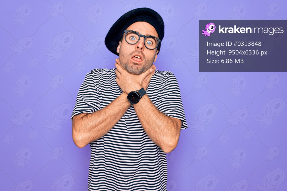 Handsome man with blue eyes wearing striped t-shirt and french beret over purple background shouting suffocate because painful strangle. Health problem. Asphyxiate and suicide concept. - Kraken Images
