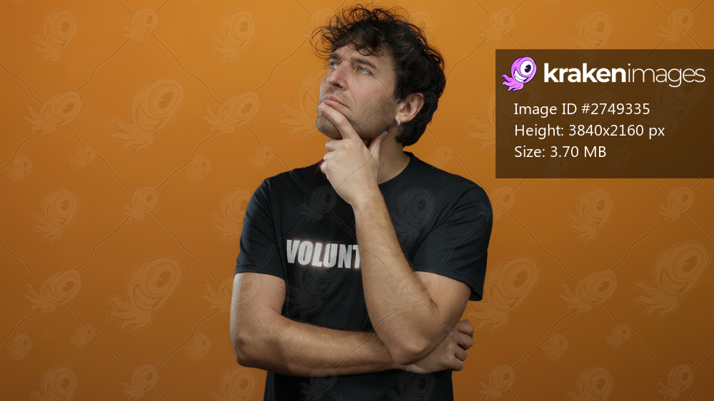 Handsome man in volunteer t-shirt pondering with finger on chin against orange background, exuding thoughtfulness and concentration, perfect for charity or contemplation themes - Kraken Images