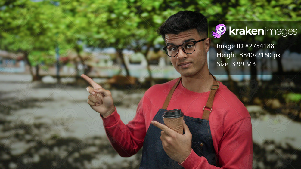 Handsome man smiling in park holding coffee wearing red shirt and glasses pointing playfully outdoors surrounded by green trees reflecting a bright sunny day. - Kraken Images