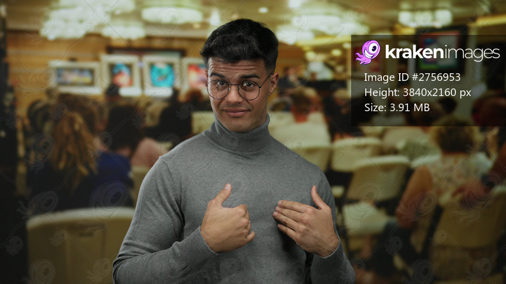 Handsome man smiling indoors in an art gallery setting with vibrant artwork in the background.