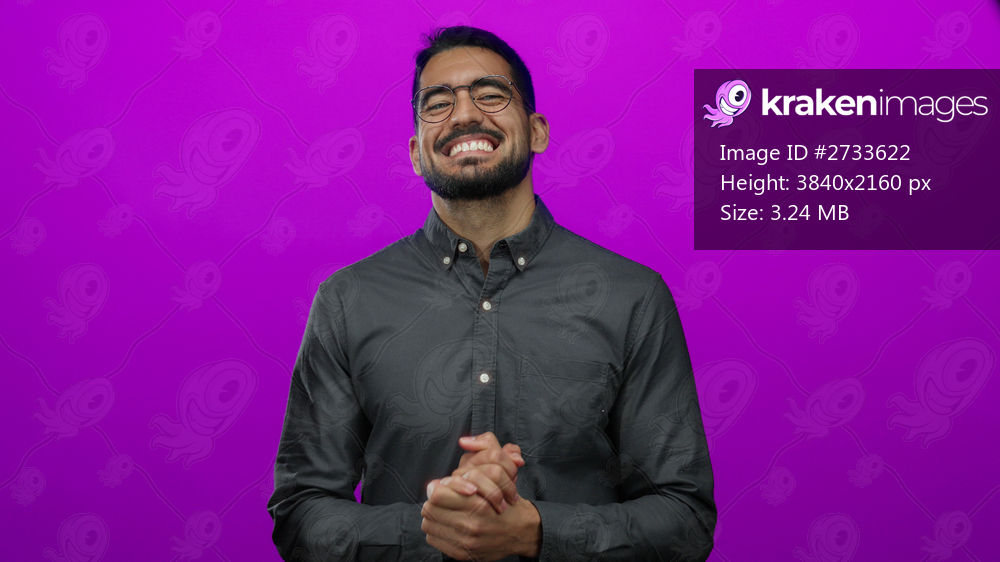 Handsome man smiling on a pink background looking happy and confident with glasses and a beard wearing a dark shirt showing joy and satisfaction in an isolated portrait. - Kraken Images