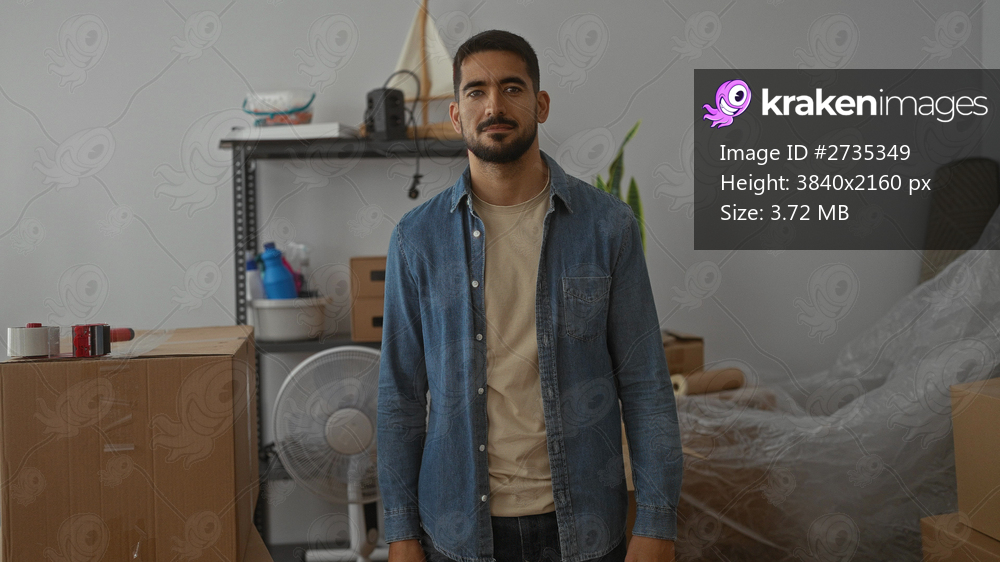 Handsome man standing confidently in a new home living room surrounded by moving boxes and household items showcasing a fresh start indoors.