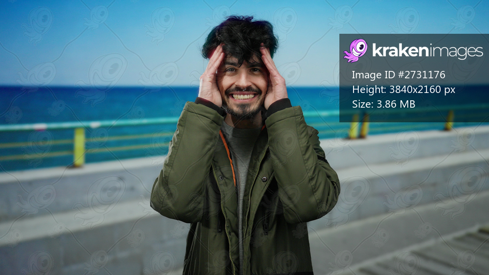 Handsome man standing on a seaside promenade with a jacket, expressing various emotions against the blue sea and sky backdrop, capturing a young adult enjoying the serene beachscape. - Kraken Images