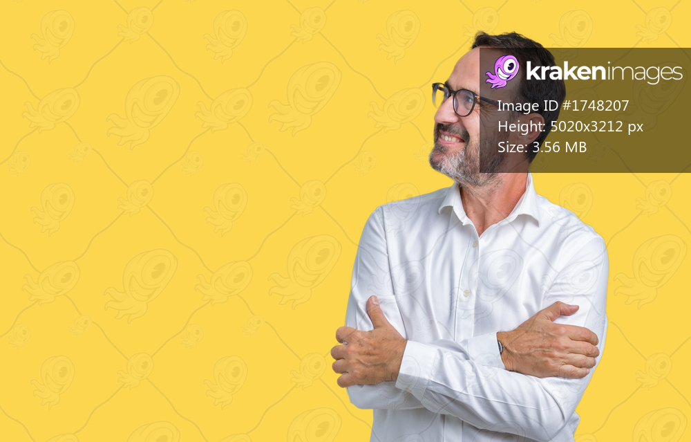 Handsome middle age elegant senior business man wearing glasses over isolated background smiling looking to the side with arms crossed convinced and confident - Kraken Images
