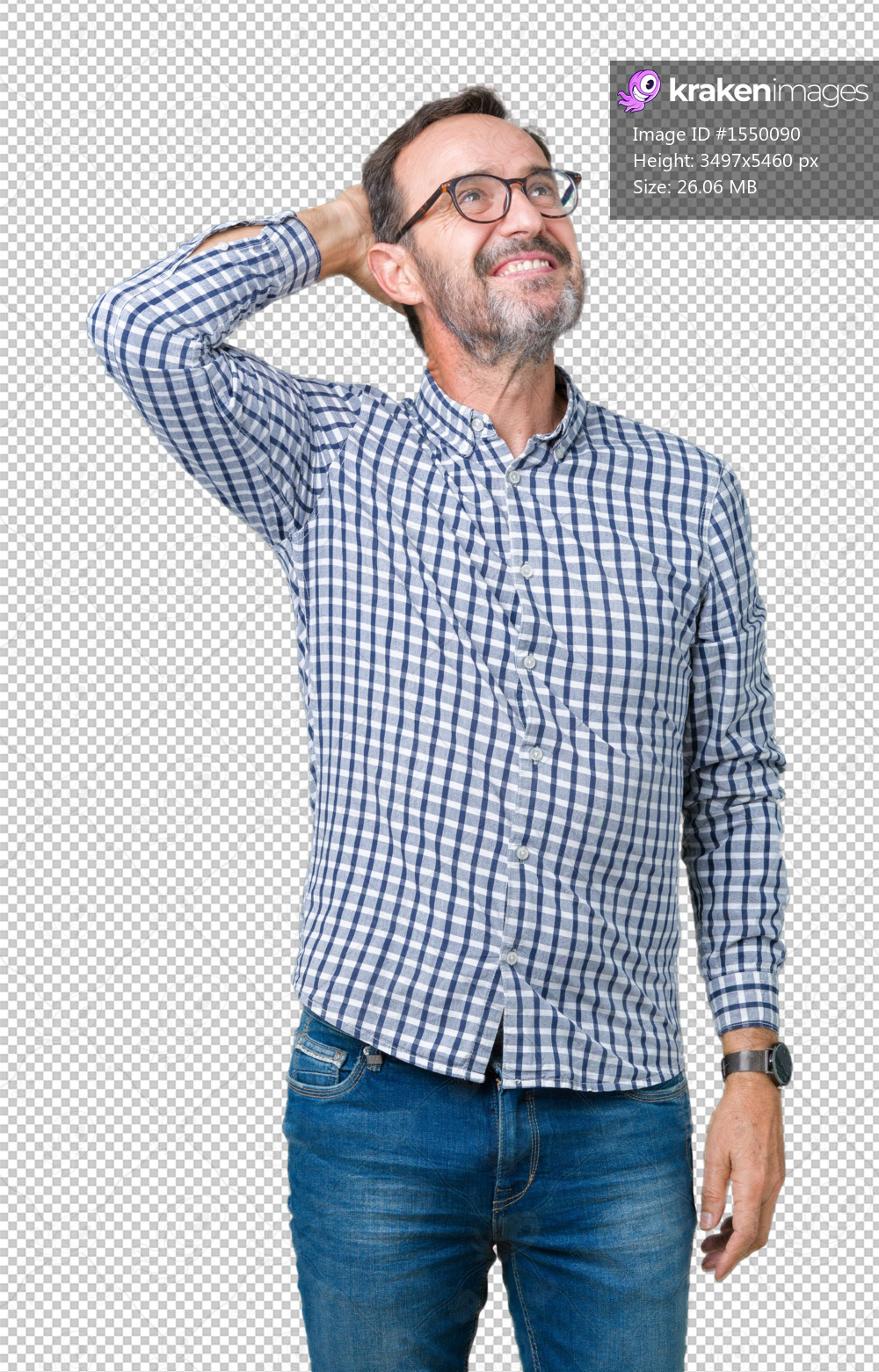 Handsome middle age elegant senior man wearing glasses over isolated background Smiling confident touching hair with hand up gesture, posing attractive - Kraken Images
