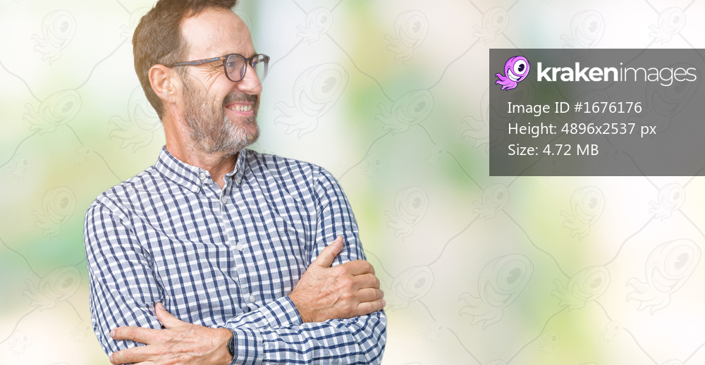Handsome middle age elegant senior man wearing glasses over isolated background smiling looking to the side with arms crossed convinced and confident