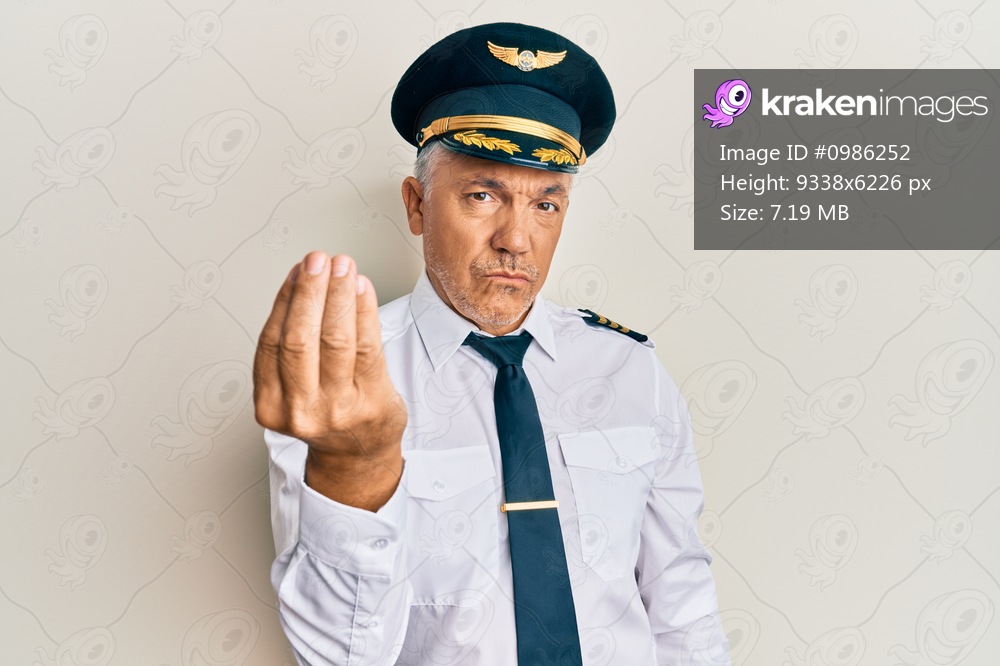 Handsome middle age mature man wearing airplane pilot uniform doing italian gesture with hand and fingers confident expression