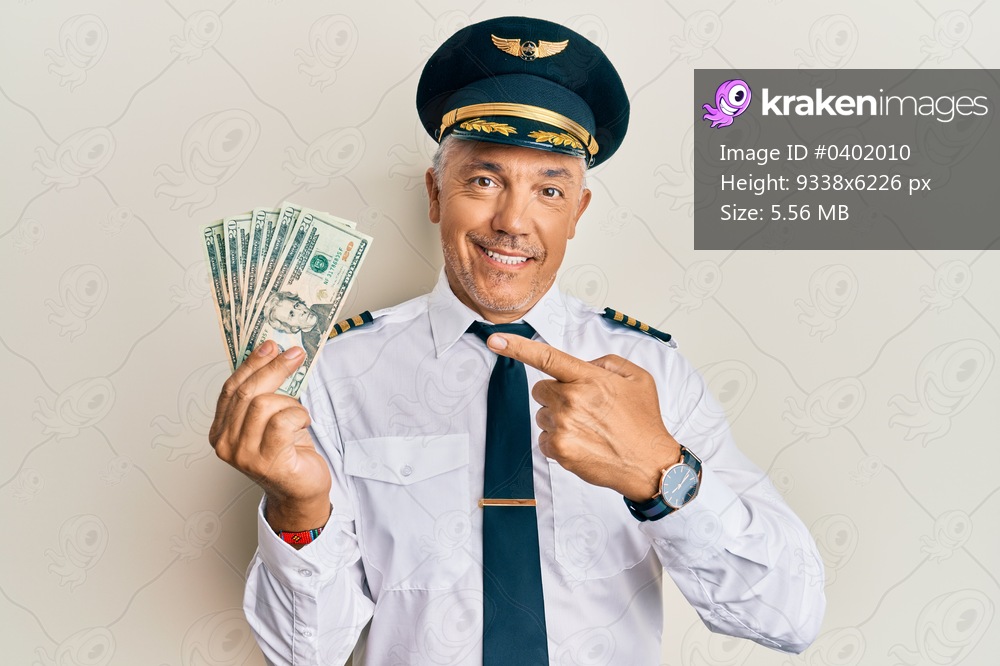 Handsome middle age mature man wearing airplane pilot uniform holding dollars smiling happy pointing with hand and finger