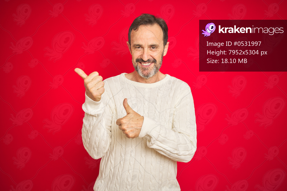 Handsome middle age senior man with grey hair over isolated red background Pointing to the back behind with hand and thumbs up, smiling confident