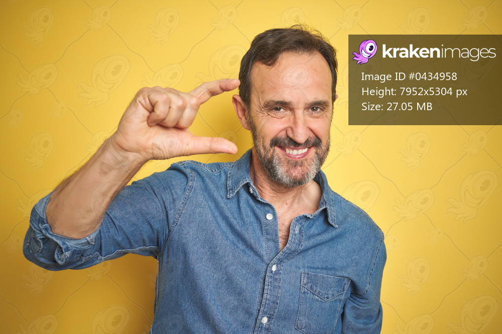 Handsome middle age senior man with grey hair over isolated yellow background smiling and confident gesturing with hand doing small size sign with fingers looking and the camera. Measure concept. - Kraken Images